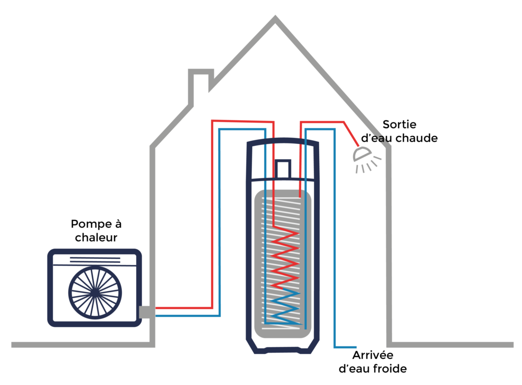 Le ballon thermodynamique intègre une pompe à chaleur capable de récupérer les calories présentes naturellement dans l’air et les restitue ensuite sous forme de chaleur, afin de produire de l’eau chaude sanitaire.